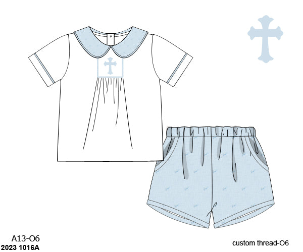 Swiss dot shorts, White top with smocked Cross