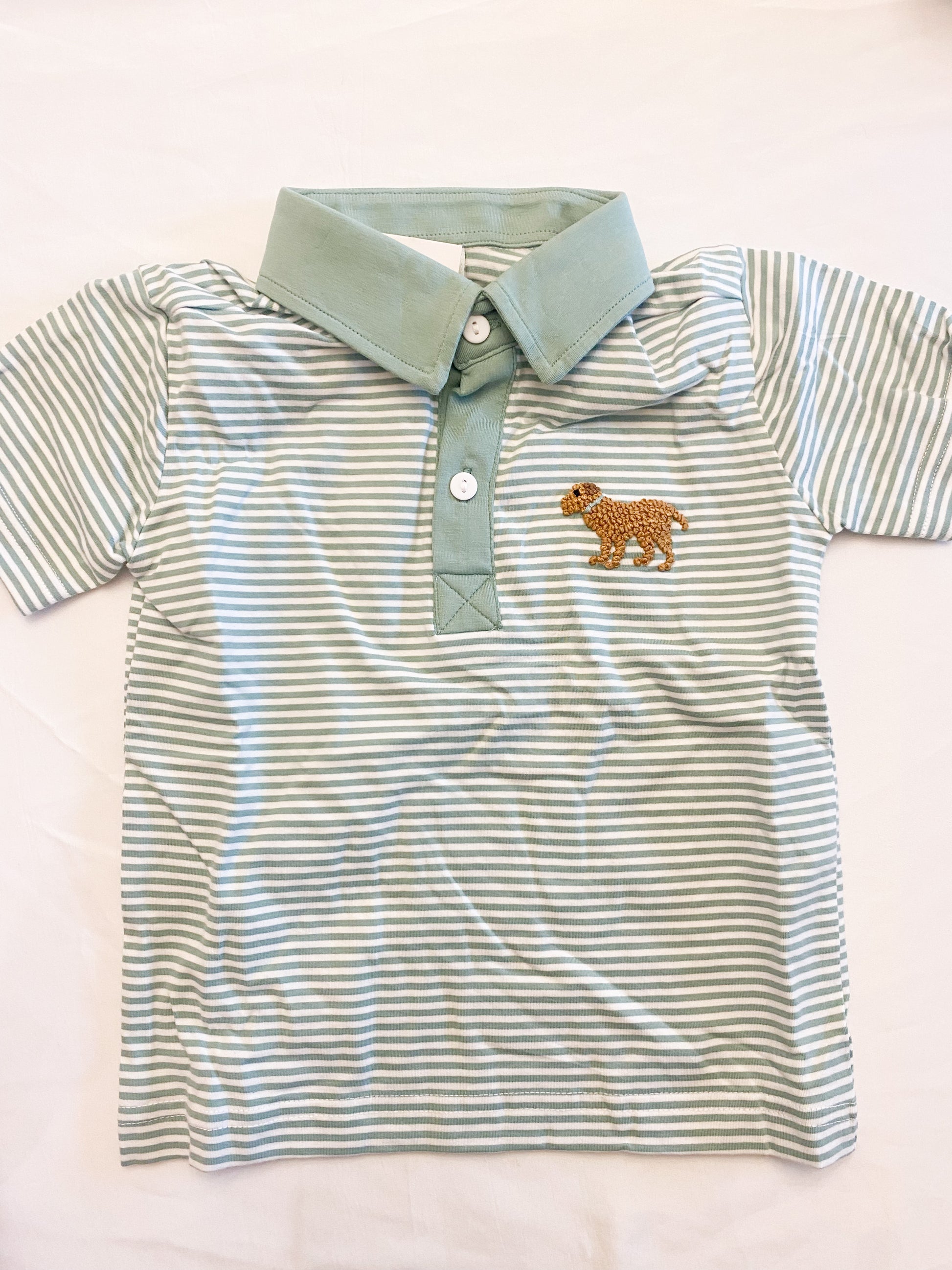 Sage striped knit polo with french knot lab
